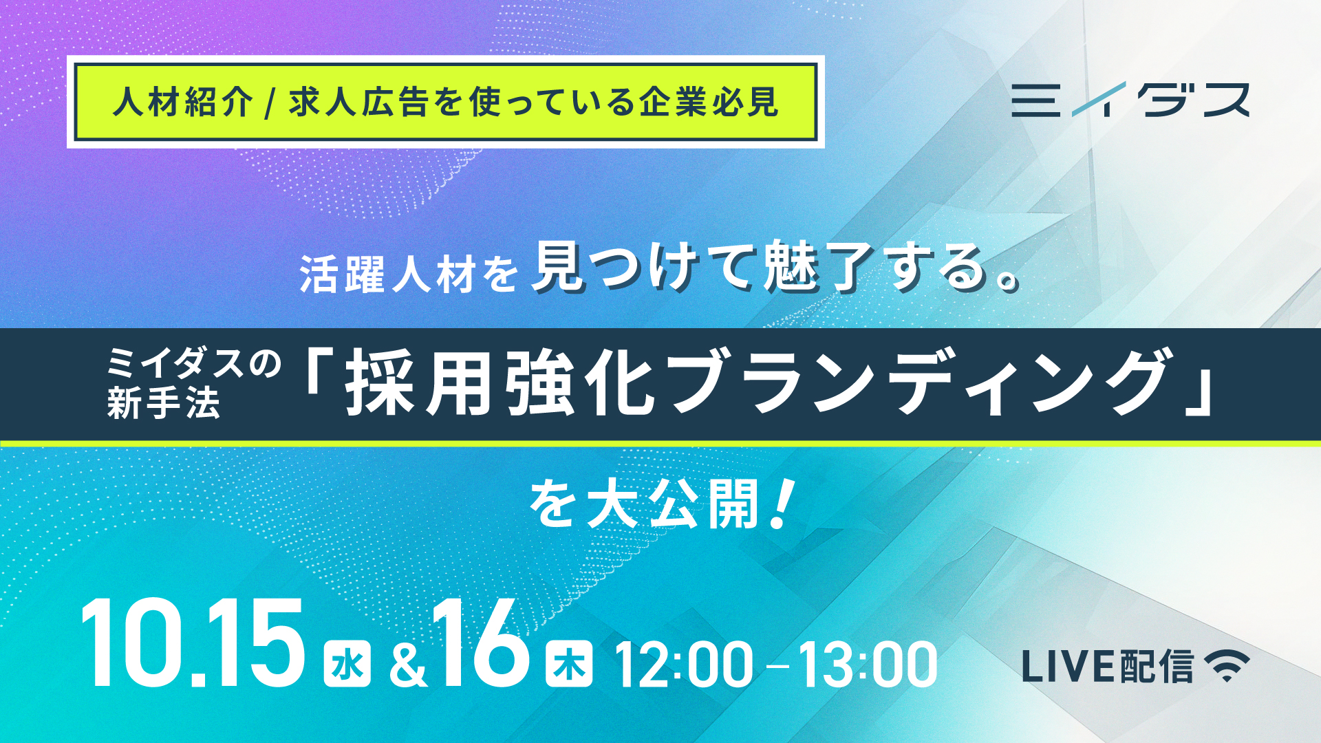 本セミナーでは、複数社の成功事例から見えてきた「工数と採用コストを抑えながら、応募を効率的に集めたい」という採用担当者共通の望みを叶えるミイダスの新手法「採用強化ブランディング」の成功の秘訣について解説いたします。